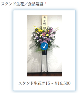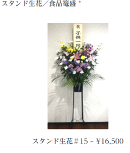 例)スタンド生花#15と食品篭盛#15など