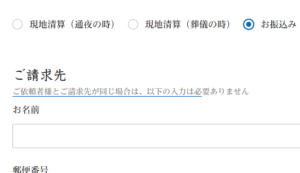 「お振込み」を選択すると「ご請求先」を入力する項目が出てきます(中写真)