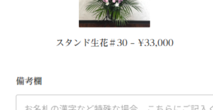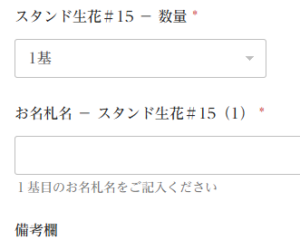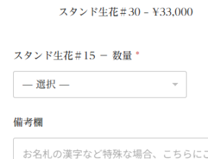 スタンド生花#15をクリックすると、真ん中の写真のように「数量」を選択する項目が出ます